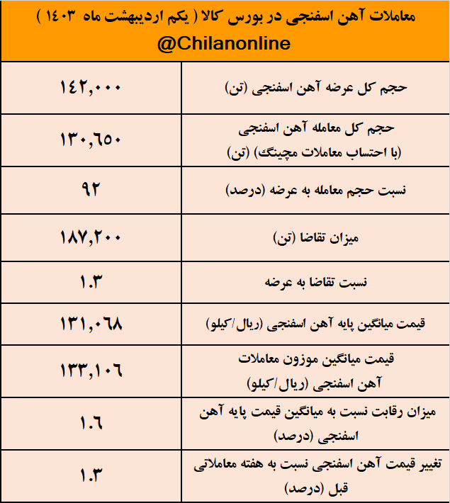 به گزارش چیلان ، امروز شنبه ۱ اردیبشهت ۱۴۰۳، بورس کالا میزبان عرضه ۱۴۲ هزار تن آهن اسفنجی بود که با توجه به ثبت تقاضای ۱.۳ برابری نسبت به عرضه، ۹۲ درصد عرضهها مورد معامله قرار گرفت.