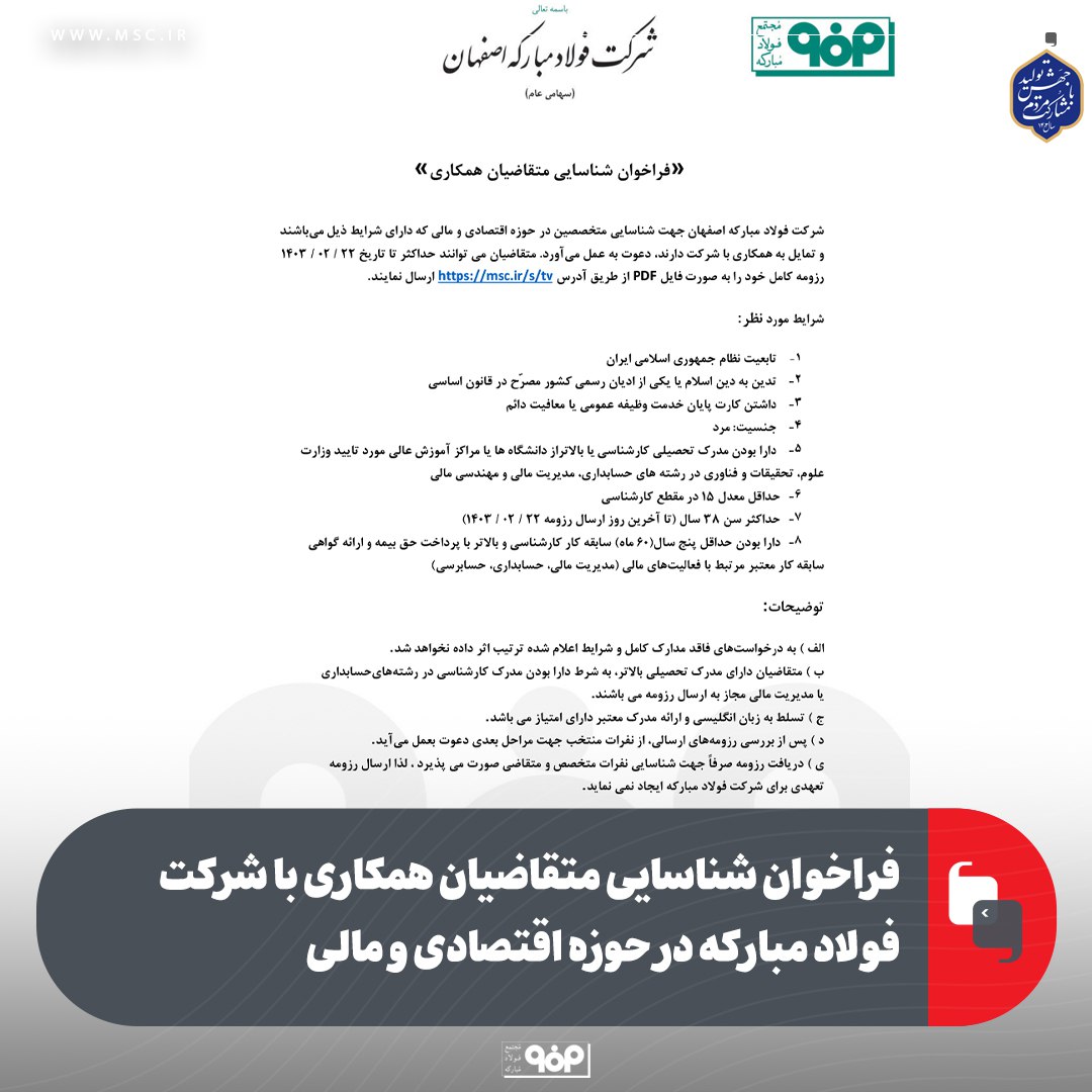 شرکت فولاد مبارکه اصفهان جهت شناسایی متخصصین در حوزه اقتصادی و مالی که دارای شرایط ذیل میباشند و تمایل به همکاری با شرکت دارند، دعوت به عمل میآورد.