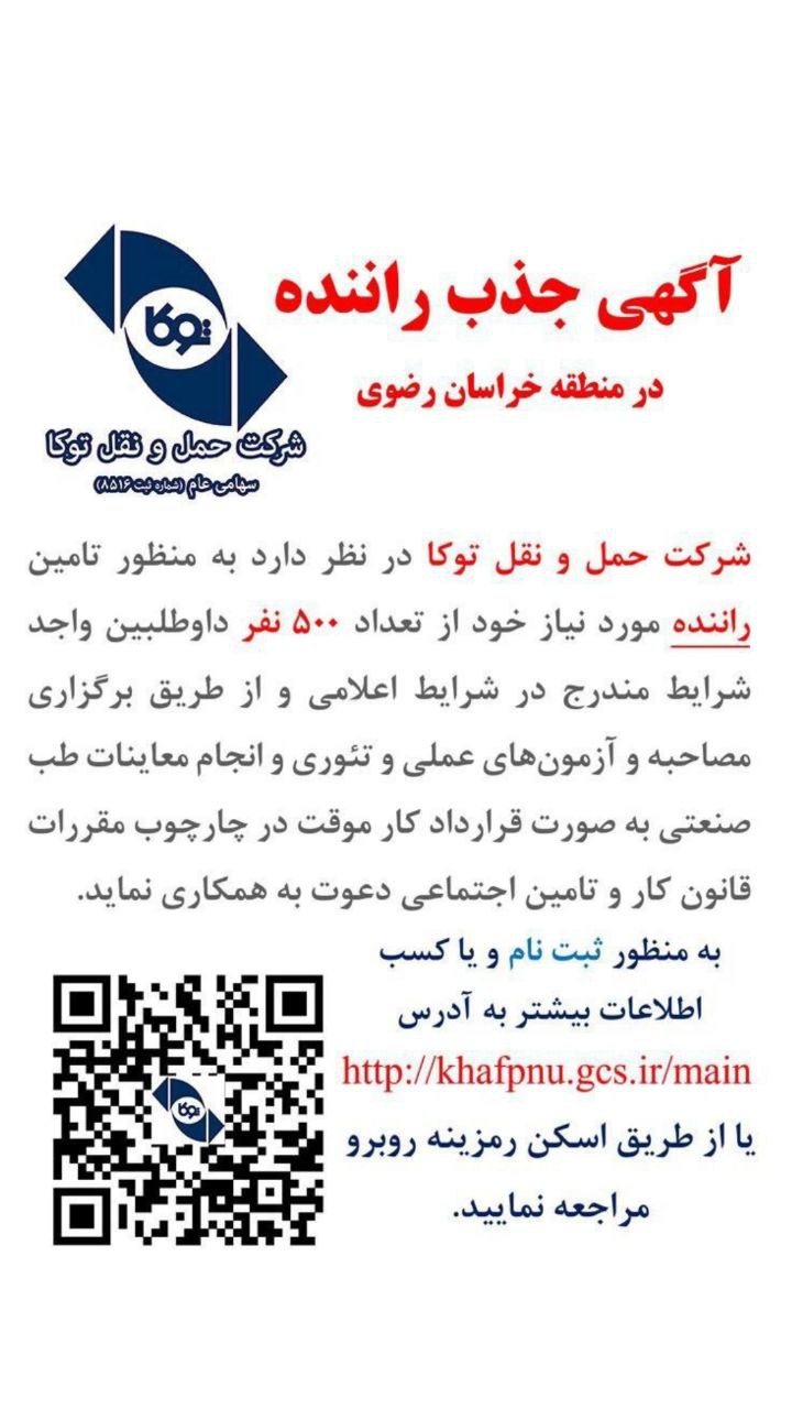 شركت حمل و نقل توکا در نظر دارد به منظور تامين نيروي انساني مورد نياز خود از تعداد 500 نفر داوطلبين واجد شرايط، در شغل راننده با شرایط مندرج در ذیل از طريق برگزاري مصاحبه و آزمون های عملی و تئوری و انجام معاينات طب صنعتی بصورت قرارداد کار موقت در چارچوب مقررات قانون کار و تامین اجتماعی در منطقه خواف و سنگان دعوت به همكاري نمايد.