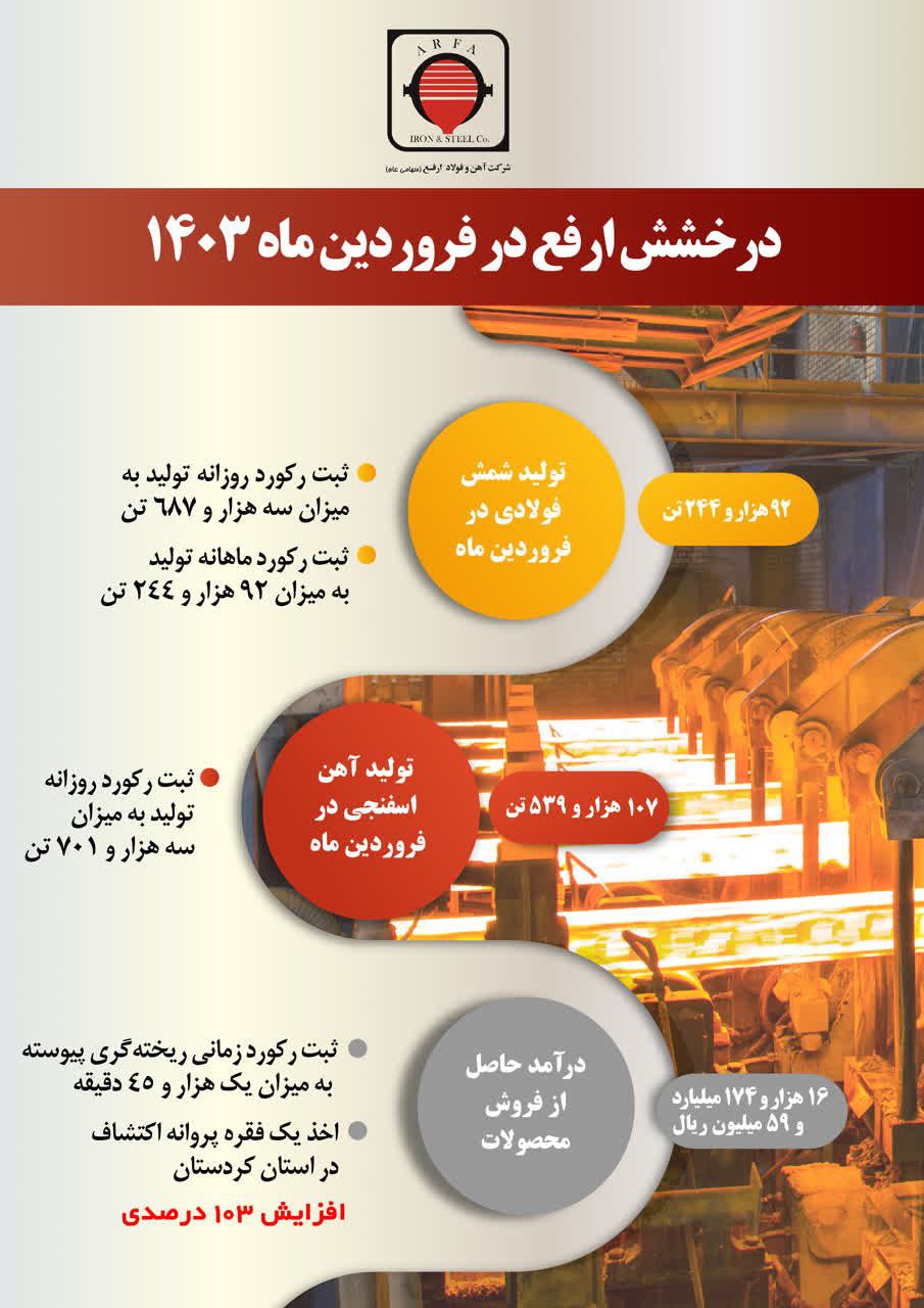 درآمد حاصل از فروش محصولات ارفع ۱۶ هزار و ۱۷۴ میلیارد و ۵۹ میلیون ریال است همیچنین ثبت رکورد زمانی ریخته گری پیوسته به میزان یک هزار و ۴۵ دقیقه و اخذ یک فقره پروانه اکتشاف در استان کردستان از دیگر مواردی است که می توان به آن ها اشاره کرد.