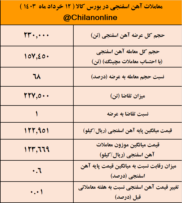 به گزارش چیلان ، امروز شنبه ۱۲ خرداد ۱۴۰۳، بورس کالا میزبان عرضه ۲۳۰ هزار تن آهن اسفنجی بود که با توجه به ثبت تقاضای ۱ برابری نسبت به عرضه، ۶۸ درصد عرضهها مورد معامله قرار گرفت.