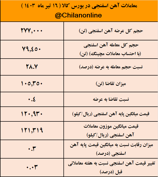 به گزارش چیلان ، امروز شنبه ۱۶ تیر ۱۴۰۳، بورس کالا میزبان عرضه ۲۷۷ هزار تن آهن اسفنجی بود که با توجه به ثبت تقاضای ۰.۴ برابری نسبت به عرضه، ۲۸ درصد عرضهها مورد معامله قرار گرفت.