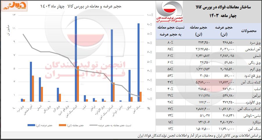 به گزارش چیلان ، به نقل از واحد آمار و اطلاعات انجمن تولیدکنندگان فولاد ایران پر متقاضیترین محصولات زنجیره آهن و فولاد در ۴ ماهه سال ۱۴۰۳ در بورس کالای ایران (با توجه به عرضه و معامله)، به ترتیب ورق سرد، آهن اسفنجی و بیلت و بلوم فولادی بودند.