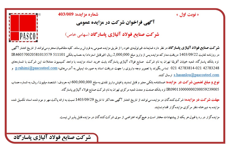 کلیه متقاضیان محترم می توانند از تاریخ انتشار آگهی در روزنامه لغایت ۱۴۰۳/۰۹/۲۲ دریافت مدارک مزایده پس از واریز مبلغ ۲,۰۰۰,۰۰۰ ریال (غیر قابل استرداد به حساب بانکی IR460570020581013579511101 نزد بانک پاسارگاد شعبه خیابان آفریقا تهران به نام شرکت صنایع فولاد آلیاژی پاسارگاد بابت خرید اسناد مزایده با واحد کمیسیون معاملات این شرکت با شماره های ۴۲۷۸۳۲۴۸ ۴۲۷۸۳۸۱۴-۰۲۱ ۰۲۱ تماس بگیرند یا تصویر وجه واریزی را جهت دریافت اسناد به صورت ایمیلی به آدرسهای p.rahimi @pascosteel.com و s.hasanlou@pascosteel.com ارسال کنند.