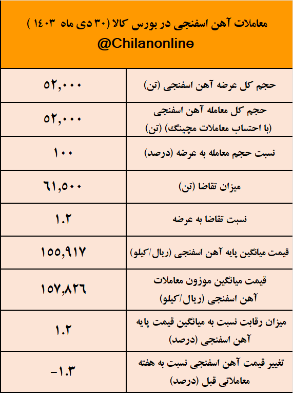 به گزارش چیلان ،۳۰ دی ۱۴۰۳، بورس کالا میزبان عرضه ۵۲ هزار تن آهن اسفنجی بود که با توجه به ثبت تقاضای ۱.۲ برابری نسبت به عرضه،۱۰۰ درصد عرضهها مورد معامله قرار گرفت.