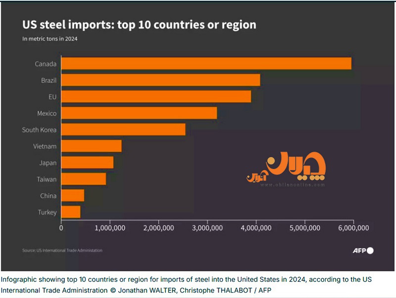 به گزارش چیلان به نقل از فرانس۲۴، امریکا در جایگاه بزرگترین اقتصاد جهان در سال ۲۰۲۳ میلادی ۲۶میلیون و ۴۰۰هزار تن آلیاژ وارد کرد و به این ترتیب پس از اتحادیه اروپا دومین بازار بزرگ فولاد خارجی بود؛ این شبکه خبری فرانسوی با انتشار نمودار زیر ۱۰ کشوری که واردکنندگان بزرگ فولاد به امریکا به شمار میآیند به همراه حجم واردات آنها در سال ۲۰۲۴ را نمایش داده است.
