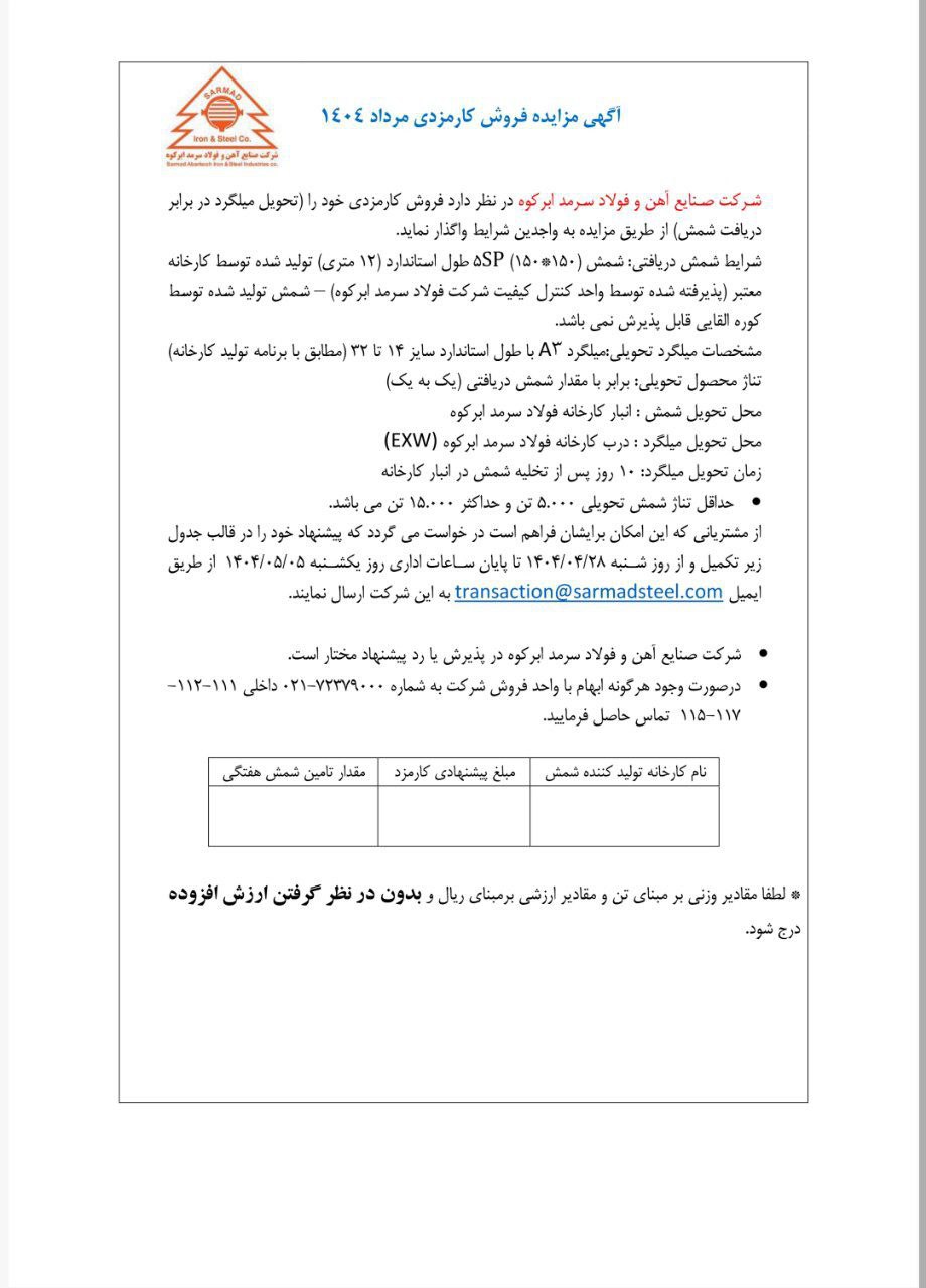 از مشتریانی که این امکان برایشان فراهم است درخواست می‌گردد که پیشنهاد خود را در قالب جدول(تصویر) تکمیل و از روز شنبه ۱۴۰۴/۰۴/۲۸ تا پایان ساعت اداری روز یکشنبه ۱۴۰۴/۰۵/۰۵ از طریق ایمیل transaction@sarmadsteel.com به این شرکت ارسال نمایند.