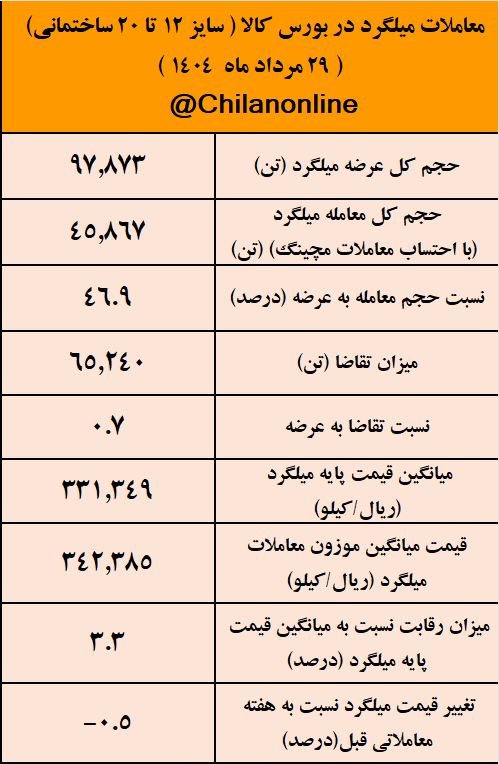 به گزارش چیلان ، ۲۹ مرداد ماه ۱۴۰۴، ۹۷ هزارتن میلگرد پرمصرف ساختمانی (سایز ۱۲ تا ۲۰) در بورس کالا عرضه شد که با احتساب معاملات مچینگ،۴۵ هزارتن معادل ۴۶ درصد از این عرضهها مورد معامله قرار گرفت.