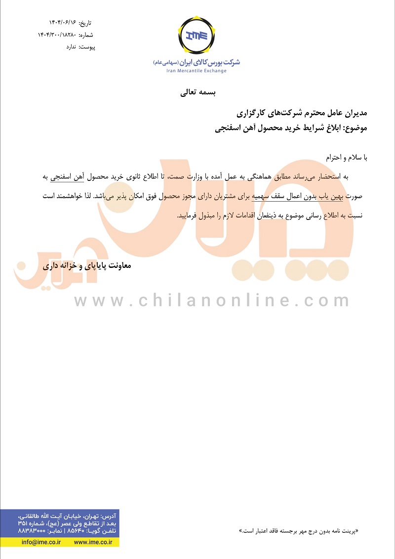 بنا بر اعلام بورس کالا پیروی هماهنگی صورت گرفته با وزارت صمت تا اطلاع ثانوی خرید محصول آهن اسفنجی به صورت بهینیاب بدون اعمال سقف سهمیه برای مشتریان دارای مجوز محصول یادشده ممکن است.