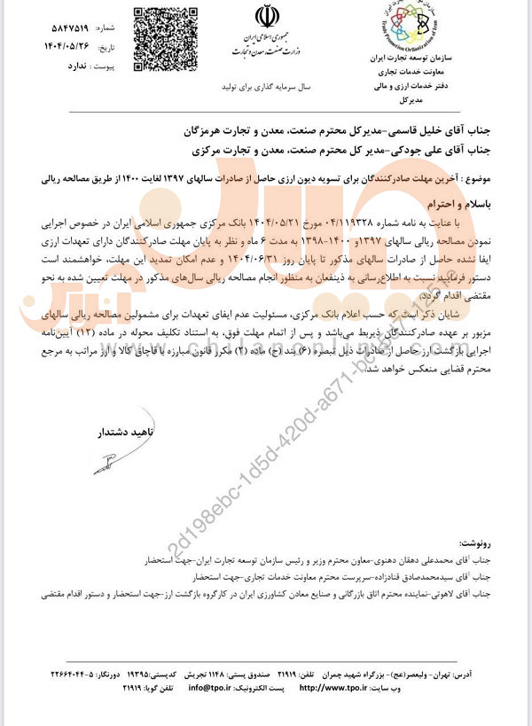 در متن نامه سازمان توسعه تجارت آمده است: با عنایت به نامه بانک مرکزی جمهوری اسلامی ایران در خصوص اجرایی نمودن مصالحه ریالی سالهای ۱۳۹۷ و ۱۴۰۰ء۱۳۹۸ به مدت شش ماه و نظر به پایان مهلت صادرکنندگان دارای تعهدات ارزی ایفانشده حاصل از صادرات سالهای یادشده تا پایان روز ۳۱۰۶۱۴۰۴ و عدم امکان تمدید این مهلت، خواهشمند است دستور فرمایید به اطلاعرسانی به ذینفعان به منظور انجام مصالحه ریالی سالهای یادشده در مهلت تعیینشده به نحو مقتضی اقدام شود.