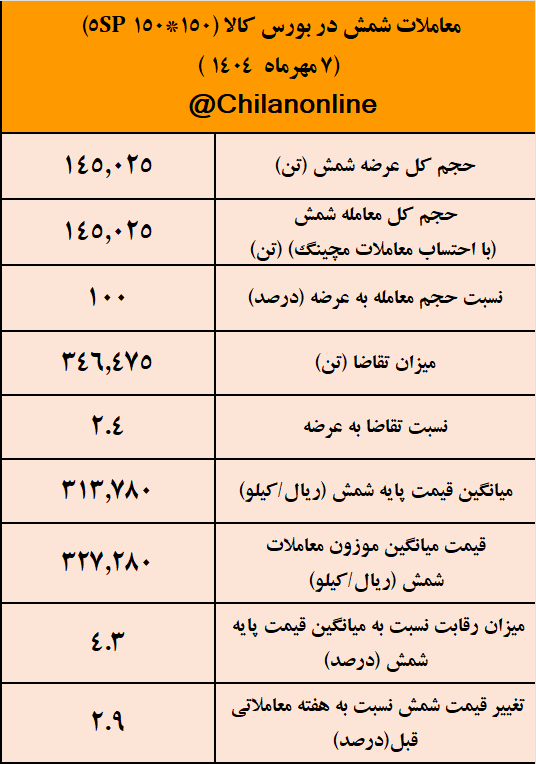 به گزارش چیلان ، ۷ مهرماه ماه ماه ۱۴۰۴، بورس کالا میزبان عرضه بیش از ۱۴۵ هزار تن شمش بلوم 5sp بود که با توجه به تقاضای ۲.۴ برابری و با احتساب معاملات مچینگ ۱۰۰ درصد این عرضهها مورد معامله قرار گرفت.