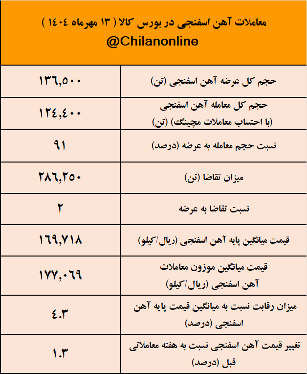 به گزارش   چیلان  ،۱۳ مهر ماه ۱۴۰۴، بورس کالا میزبان عرضه ۱۳۶ هزار تن آهن اسفنجی بود که با توجه به ثبت تقاضای ۲ برابری نسبت به عرضه، ۹۱ درصد عرضه‌ها مورد معامله قرار گرفت.