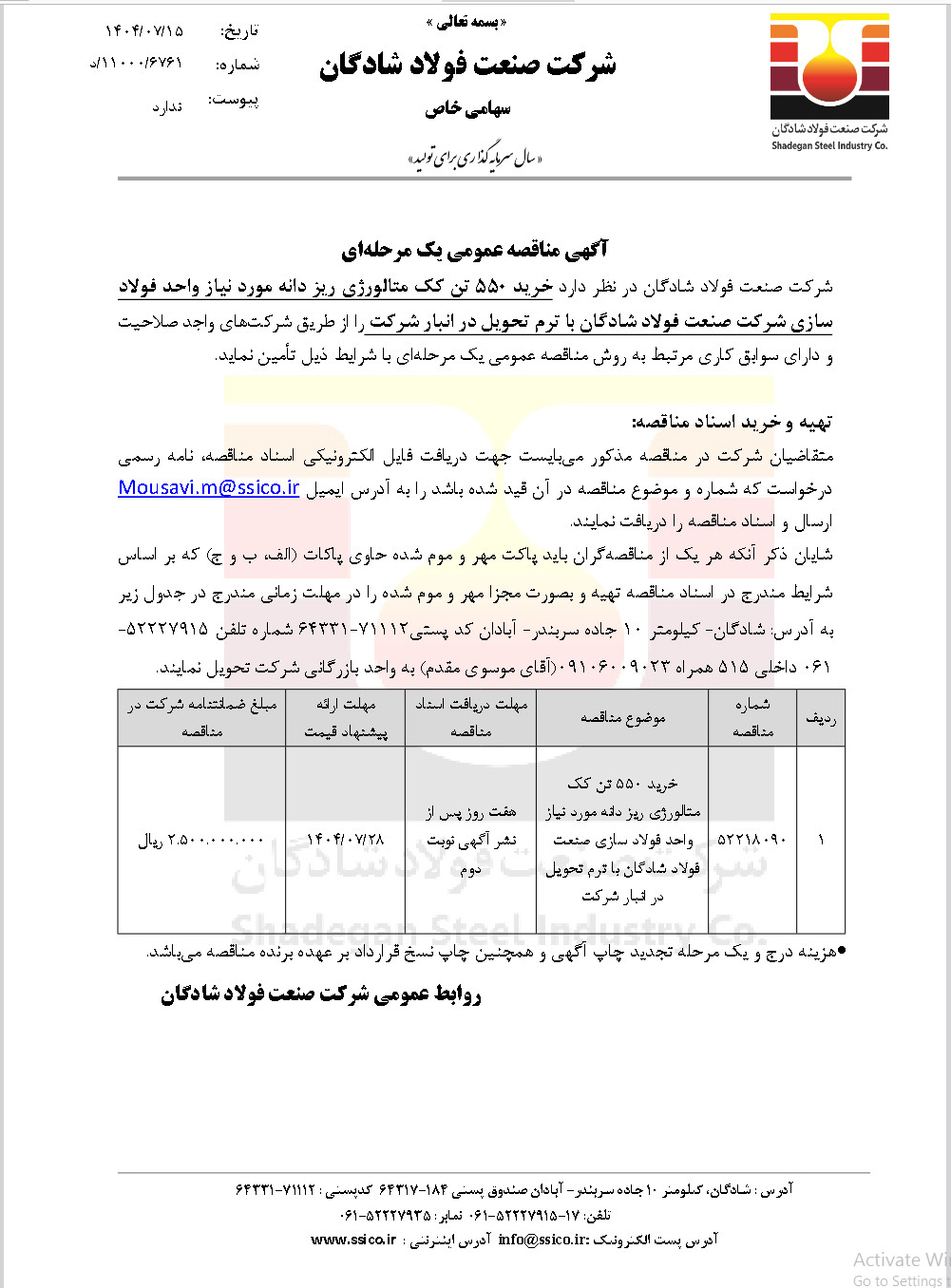 به گزارش چیلان ، شرکت صنعت فولاد شادگان در نظر دارد خرید ۵۵۰ تن کک متالورژی ریز دانه مورد نیاز واحد فولاد سازی شرکت صنعت فولاد شادگان با ترم تحویل در انبار شرکت را از طریق شرکتهای واجد صلاحیت و دارای سوابق کاری مرتبط به روش مناقصه عمومی یک مرحلهای با شرایط ذیل تأمین نماید.