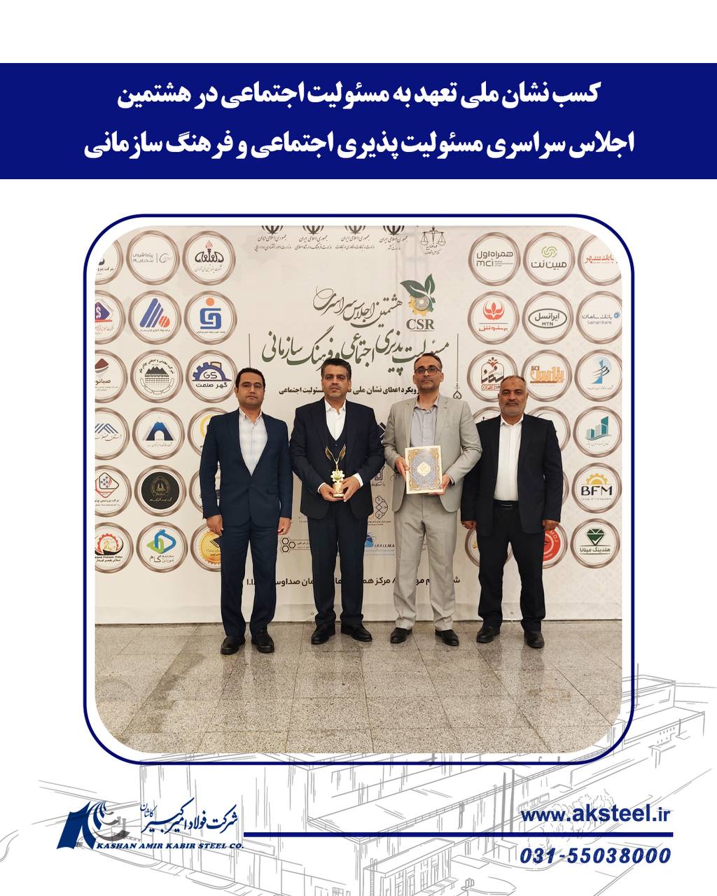 به گزارش چیلان ، در هشتمین اجلاس سراسری مسئولیتپذیری اجتماعی و فرهنگ سازمانی، فولاد امیرکبیر کاشان موفق به دریافت نشان ملی تعهد به مسئولیت اجتماعی شد. این رویداد روز چهارشنبه ۱۶ مهر ۱۴۰۴ با حضور معاون رئیسجمهوری، نمایندگان مجلس و مدیران صنایع در مرکز همایشهای صداوسیما برگزار شد.