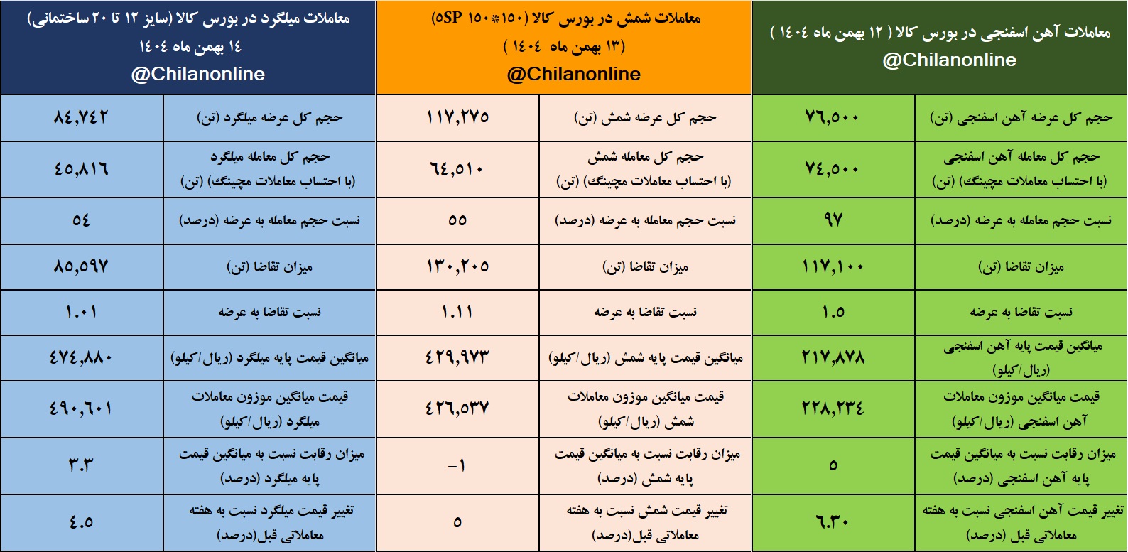 ۱۴ بهمن ماه ۱۴۰۴، ۸۴ هزارتن میلگرد پرمصرف ساختمانی (سایز ۱۲ تا ۲۰) در بورس کالا عرضه شد که با احتساب معاملات مچینگ،۴۵ هزارتن معادل ۵۴ درصد از این عرضهها مورد معامله قرار گرفت.